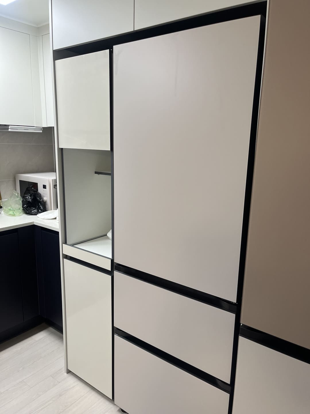 사진으로 보면 색상이 묘하게 다른가 싶지만 실제로 보면 비슷하다! 아마 조명탓인듯. 상/하부장이 옆에 오브제 김치냉장고랑 수평도 잘 맞아서 볼때마다 기분이 좋다. 높이도 아주 살짝 차이가 있지만 그렇게 거슬리는 정도는 아니기 때문에 매우 만족!🤩🤩