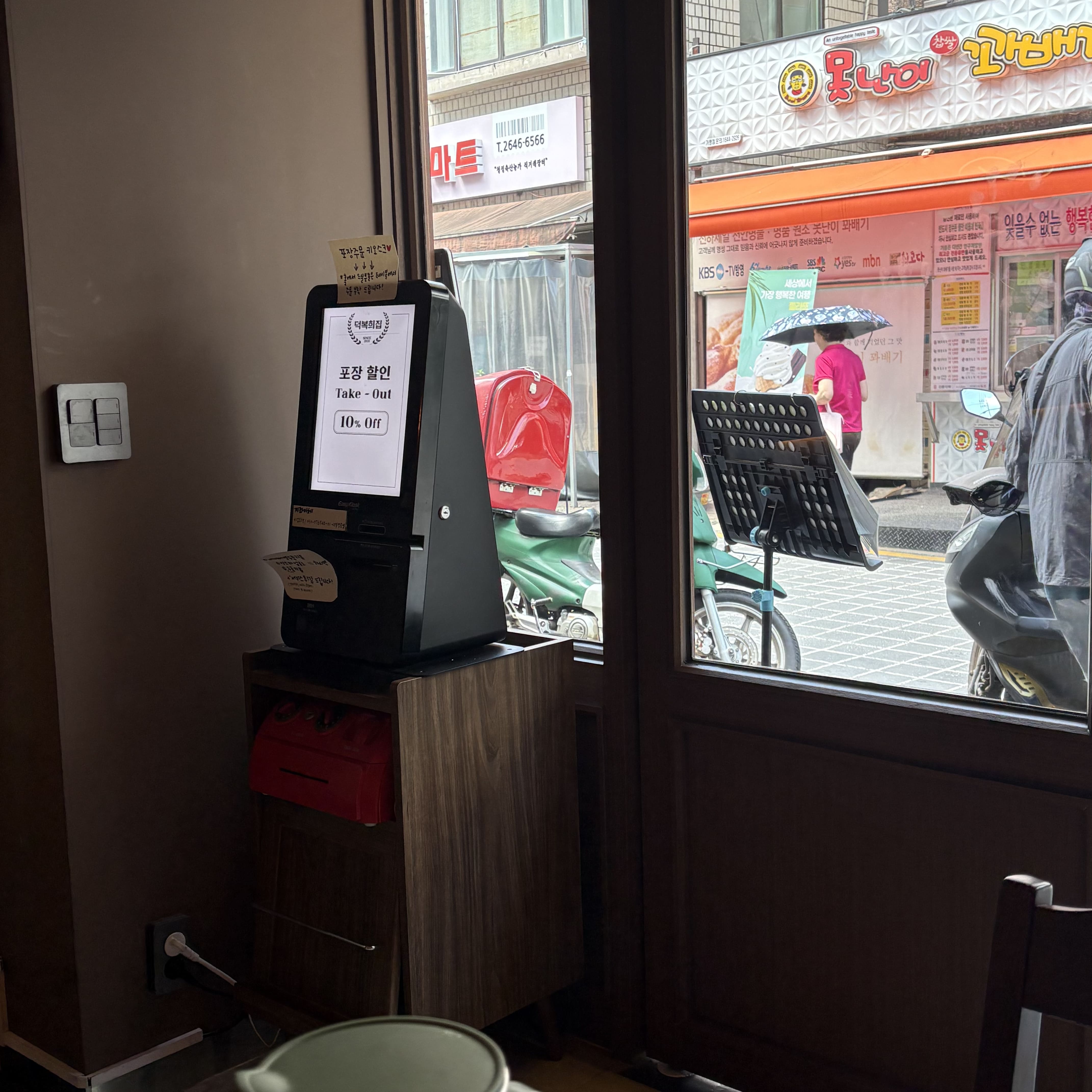포장으로 하는 경우엔 앞쪽 키오스크에서 별도로 주문이 가능한데, 매장에서 먹는 사람들은 각 테이블에 있는 태블릿을 이용해서 주문해야한다. 우리는 그것도 모르고 여기서 주문해서 한번 반품했었음(여기는 자동으로 10% 할인된 금액으로 나옴)