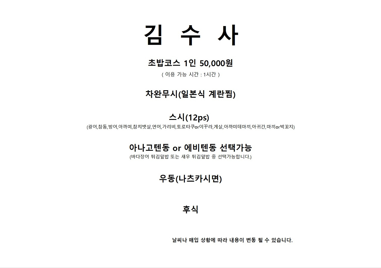 김수사 점심 스시는 5만원이며, 5만원이라는 가격이 놀랍게 코스는 아주 알차게 되어 있다. 차완무시(계란찜), 스시 12피스, 텐동, 우동에 후식까지 정말 완벽하게 즐길 수 있다.