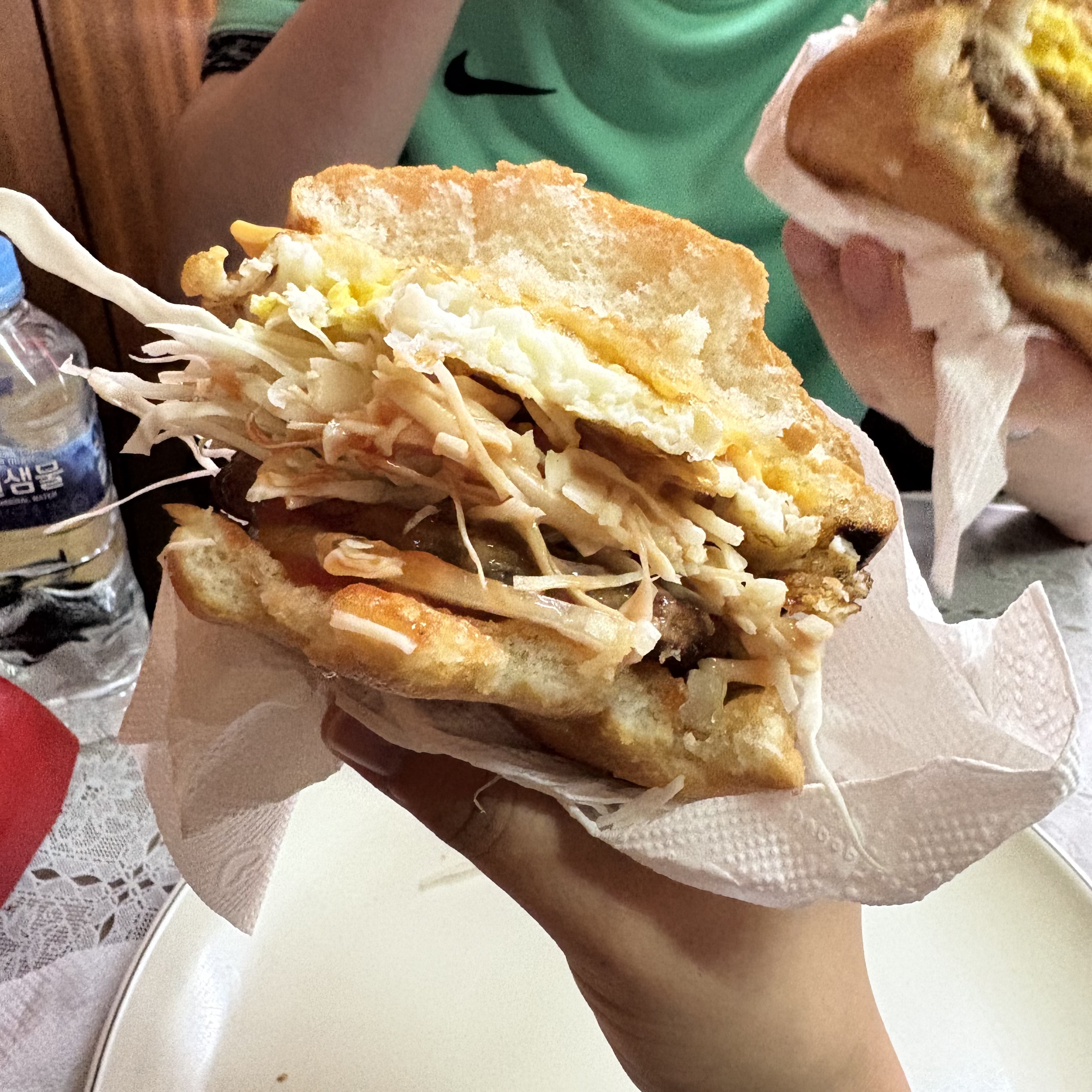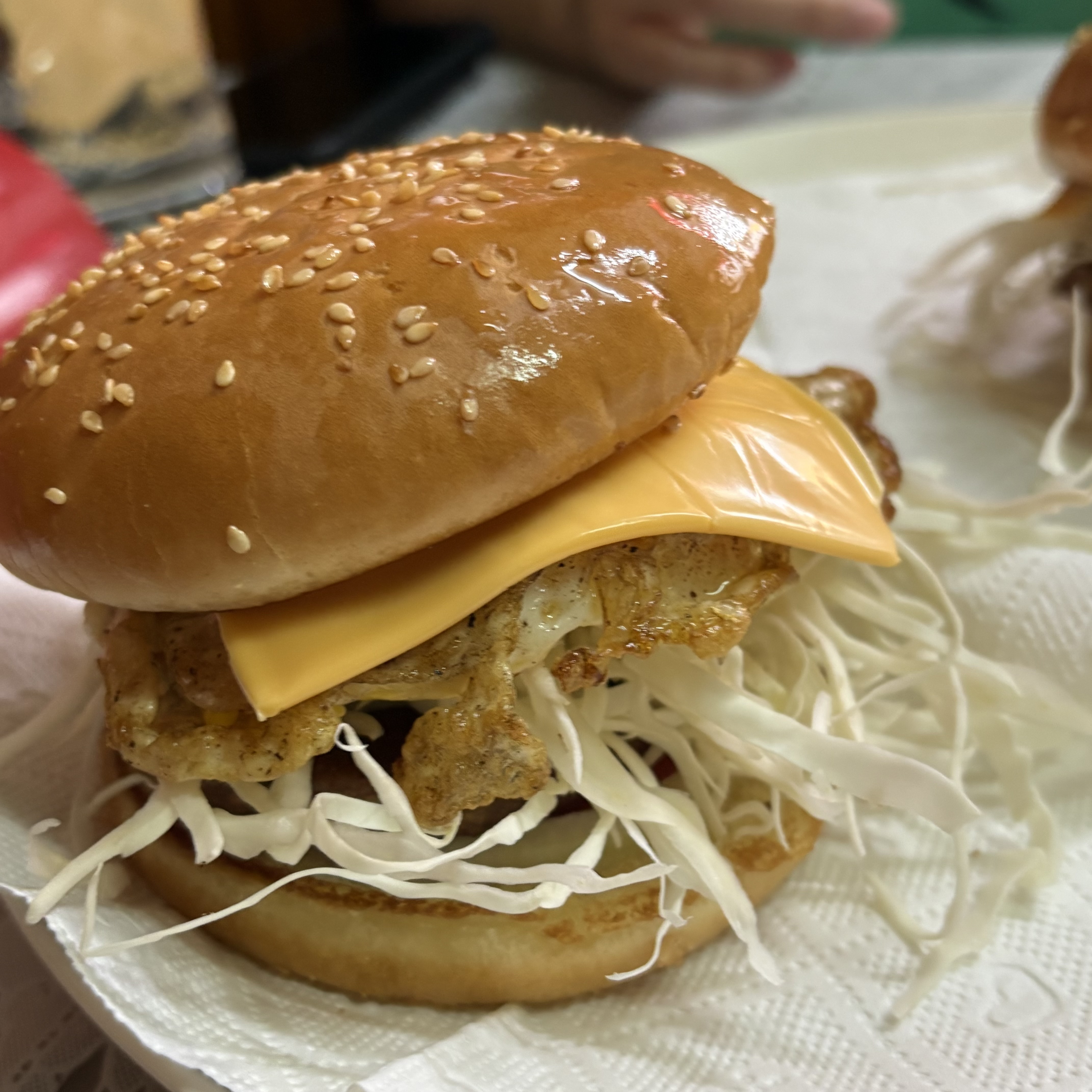 햄버거는 정말 우리가 아는 옛날 그맛! 햄버거번 + 치즈+ 계란후라이 + 케요네즈 듬뿍 들어간 양배추여서 엄마가 예전에 간식으로 만들어 준듯한 느낌이다. 개인적으로는 극극극호호호