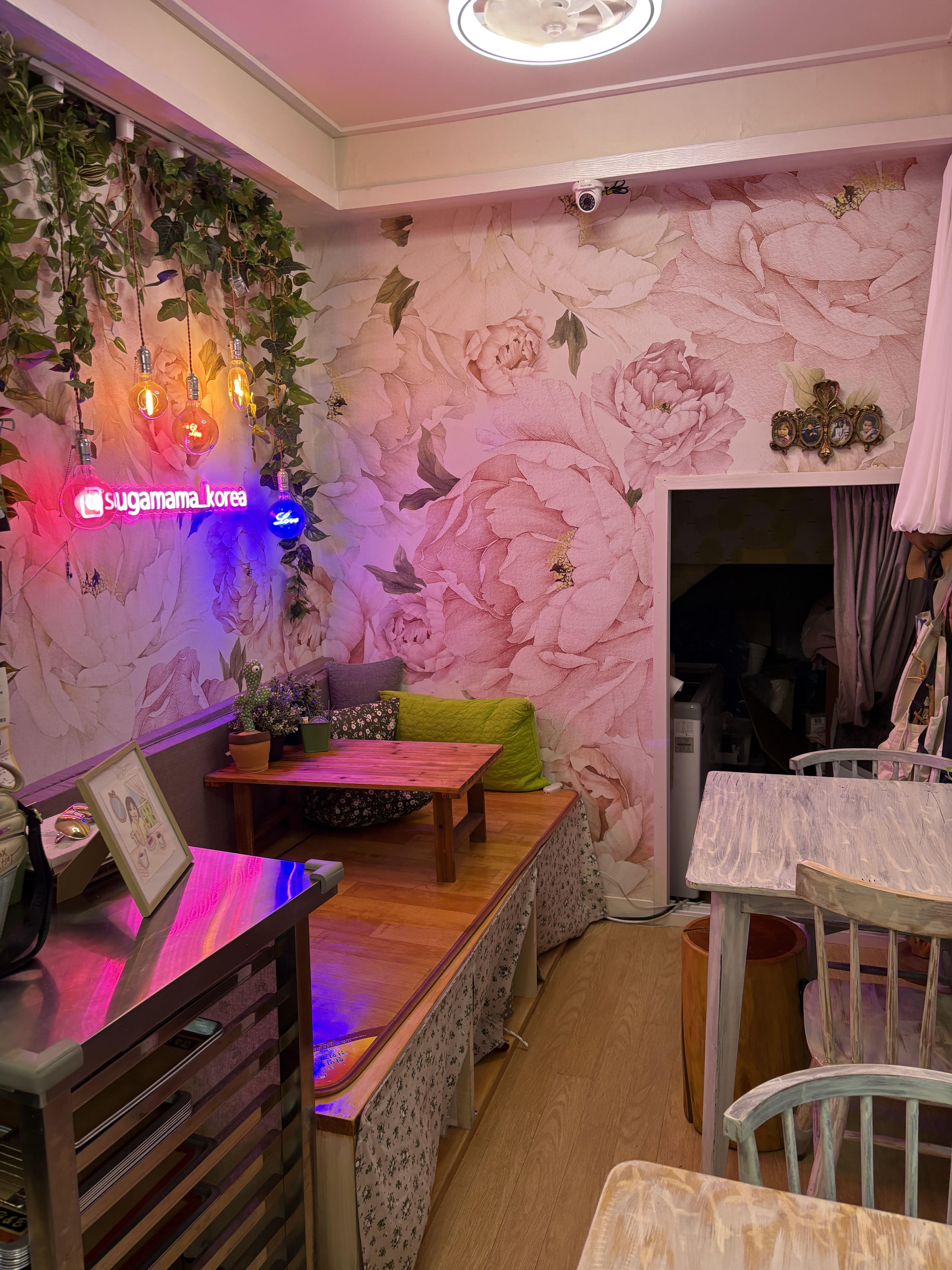 개인적으로는 내부가 정말 특이하다고 생각했음. 좌식 테이블도 있어서 뭔가 주택을 개조했나? 싶은 구성이었다. 그 와중에 꽃들이 잔뜩 있는 인테리어가 돋보였다. 미국 가정 인테리어가 이럴려낭