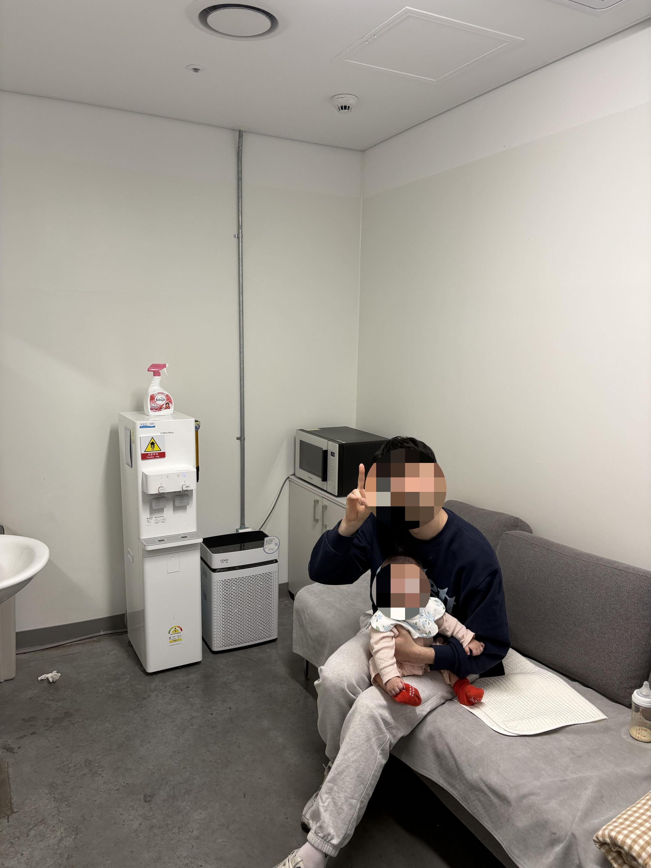 수유실 내부에는 정수기, 공기청정기, 전자레인지, 세면대, 기저귀갈이대, 큰 소파가 있다. 따로 수유를 위한 의자를 두고 있진 않고 큰 소파를 두고있다. 기저귀 갈이대도 화장실에 있는 것과 동일해서 왠만하면 기저귀 패드를 깔고 쓰는 것이 좋을 듯하다.